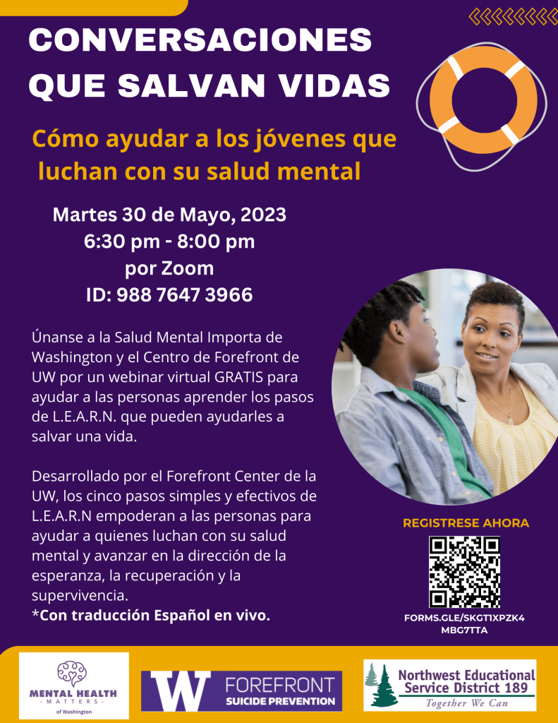 – Many of us have confided in others during dark times, and vice versa. But it can feel awkward, if not downright frightening, not knowing what to do when a loved one or a peer shows suicide warning signs. Mental Health Matters of Washington, in partnership with Northwest Regional Education Service District – Official, @UW Forefront Suicide Prevention Center, and UW Bothell School of Nursing and Health Studies, is hosting a FREE, virtual webinar to help people L.E.A.R.N. the steps to help someone who may be contemplating taking their life. Developed by UW’s Forefront Center, the five simple and effective L.E.A.R.N steps empower individuals to help others move in the direction of hope, recovery, and survival.