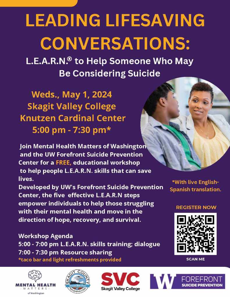 Where: Skagit Valley College in Mount Vernon – Knutzen Cardinal Center. Many of us have confided in others during dark times, and vice versa. But it can feel awkward, if